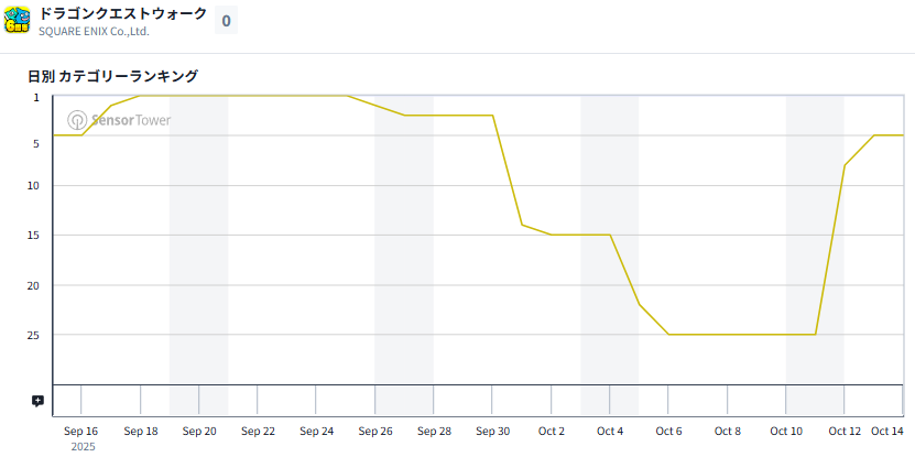 スクウェア・エニックス『ドラゴンクエストウォーク』が25位から5位にランクアップし、TOP3入りが視野に入っている。10月9日より「6周年記念イベントクエスト~英雄を継ぐ者~」第5章にあわせて、新コンテンツ「そろえてドラぽか」、「白き英雄装備ふくびき」を追加している。
