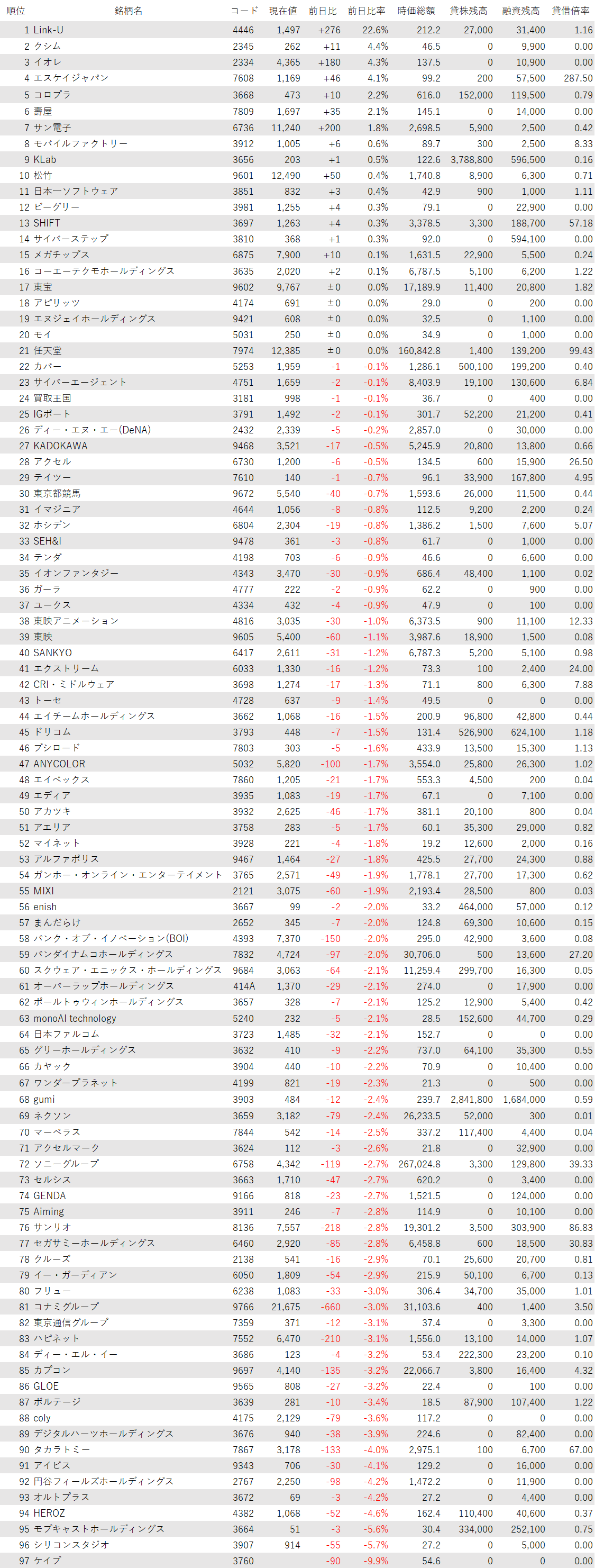 アニメやホビーなどその他コンテンツ関連銘柄は、東宝<9602>が変わらず、タカラトミー<7867>、サンリオ<8136>、KADOKAWA<9468>、IGポート<3791>、GENDA<9166>、東映アニメ<4816>、エディア<3935>、フリュー<6238>、ブシロード<7803>が安い。