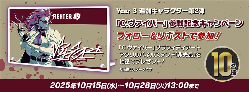 なお、「C.ヴァイパー」の参戦を記念し、グラフィティアートを使ったアクリルパネルスタンドが抽選で当たるSNSキャンペーンも本日より開催されている。キャンペーン期間は10月15日から10月28日13:00までで、公式Xアカウントをフォローし、キャンペーンポストをリポストすることで参加できる。賞品は非売品の「C.ヴァイパー」グラフィティアート アクリルパネルスタンドで10名に当たる。