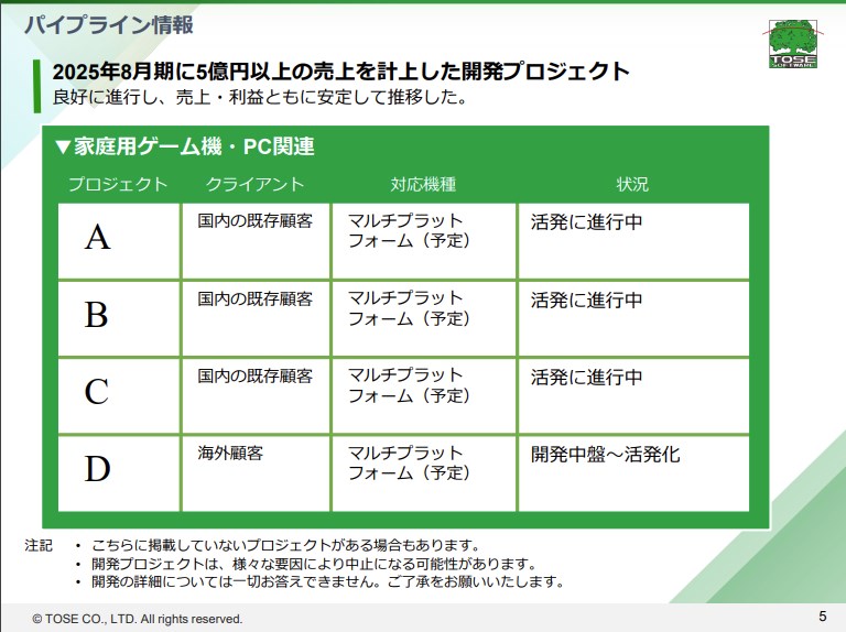 なお、2025年8月期に5億円以上の売上を計上した開発プロジェクトは、国内の既存顧客向けのマルチプラットフォーム(予定)タイトル3本の開発が活発に進行中であるほか、海外顧客向けのマルチプラットフォーム(予定)タイトルも開発中盤から活発化している。