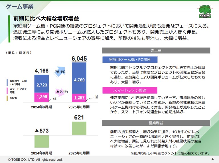 トーセ<4728>は、10月9日に2025年8月期の連結決算を発表した。今回はその決算説明資料から同社のゲーム事業について取り上げたい。