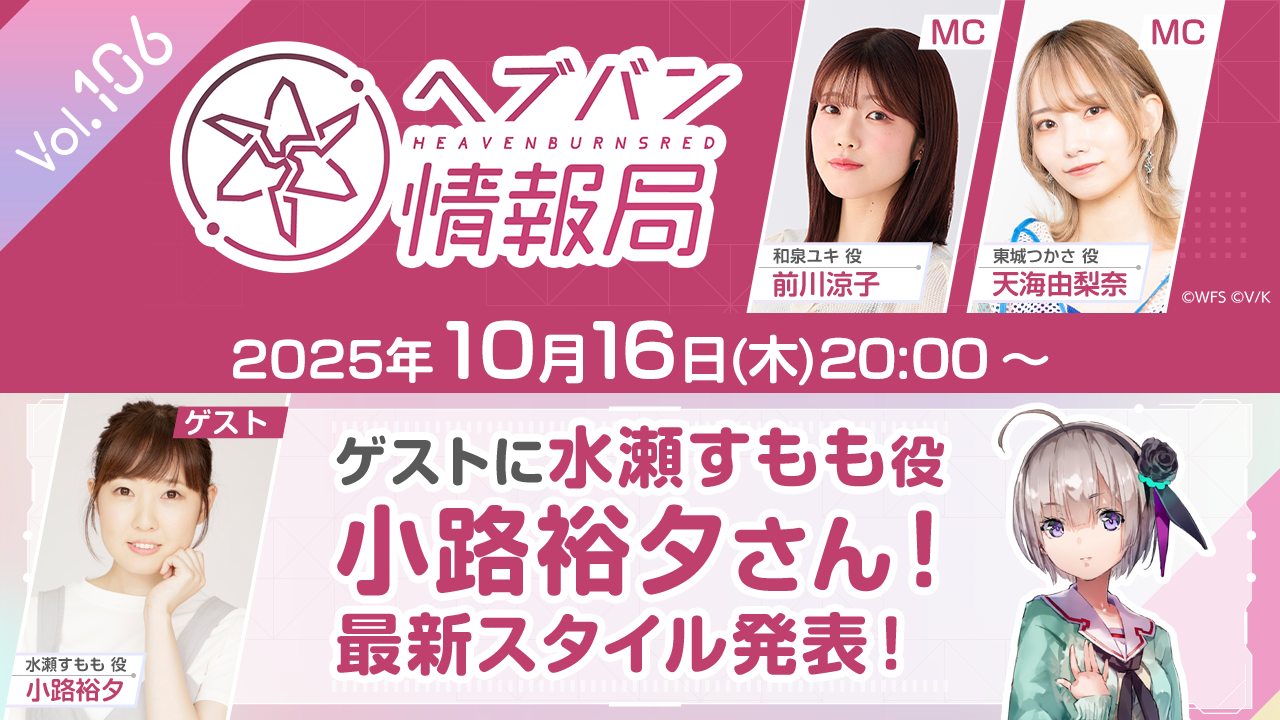 ライトフライヤースタジオとKeyは、ドラマチックRPG『ヘブンバーンズレッド』は、2025年10月16日20:00より公式YouTubeチャンネルで、公式番組「ヘブバン情報局 Vol.106」を生放送する。ゲストに水瀬すもも役 小路裕夕さんを迎え、最新スタイルを発表する。