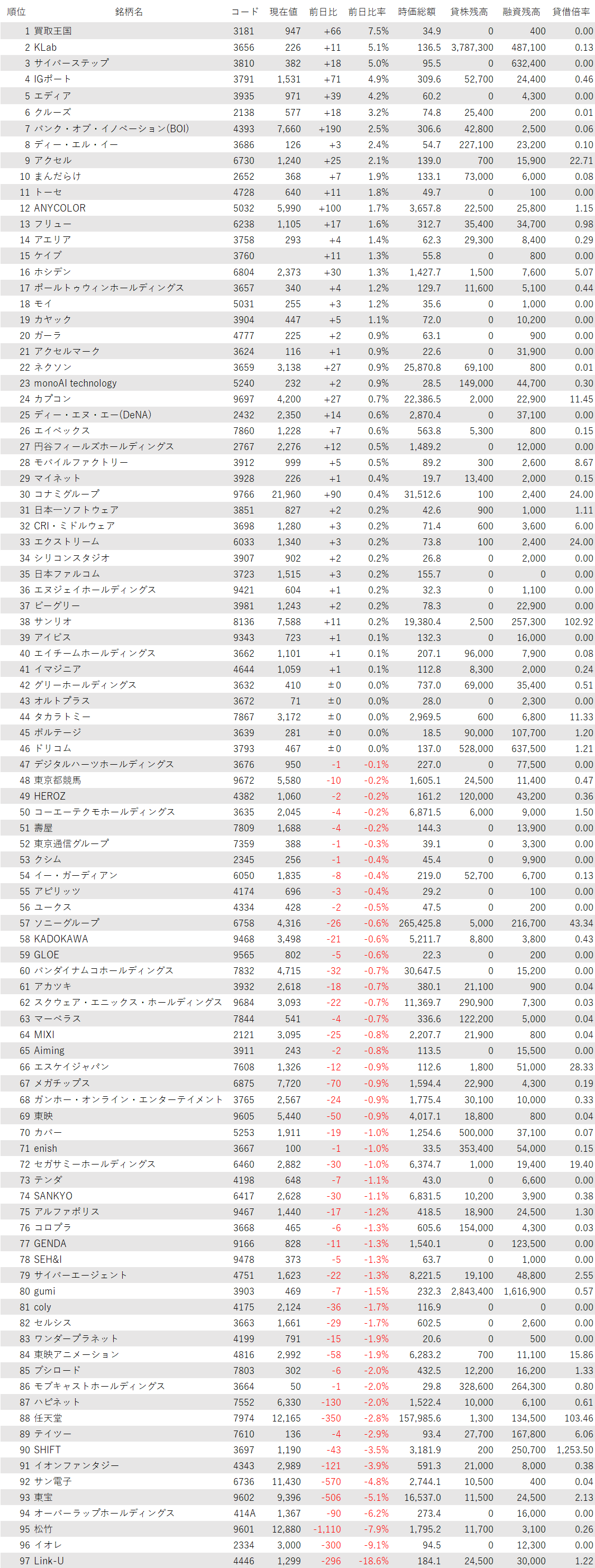 モバイルゲーム系の銘柄は、DeNA<2432>、ケイブ<3760>、モバイルファクトリー<3912>が高く、グリーHD<3632>が変わらず、サイバーエージェント<4751>、MIXI<2121>、ガンホー<3765>、アカツキ<3932>、コロプラ<3668>が安い。
