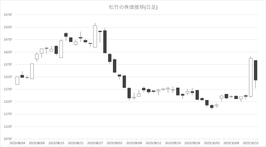 半導体など主力株に資金が集まった一方、物色対象になりづらいエンタメ関連は総じて小動きだったが、6~8月決算発表銘柄が上下に関わらず活発に動いた。買取王国<3181>やサイバーステップ<3810>、IGポート<3791>が買われた一方、松竹<9601>、オーバーラップHD<414A>、東宝<9602>が売られた。直近で急騰していたLink-U<4446>が利食い売りに押された。