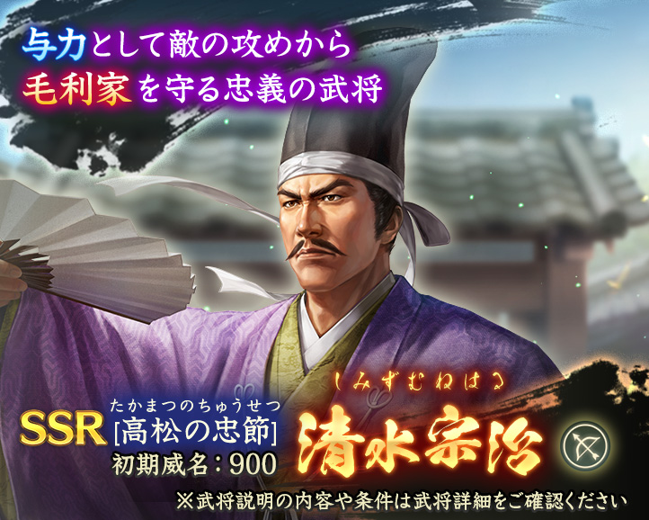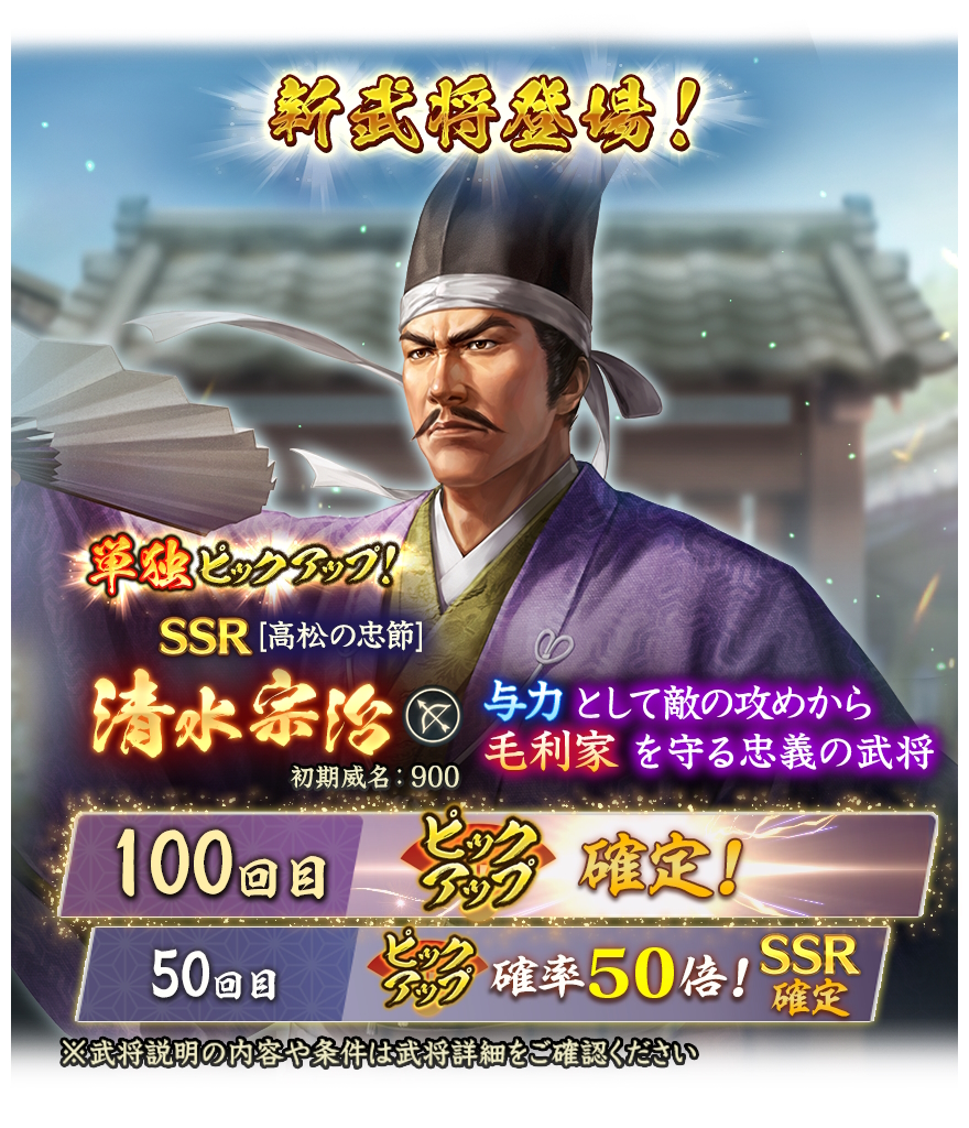 初登場のSSR【高松の忠節】清水宗治(初期威名900)が単独ピックアップされる登用。50回目でSSR確定、100回目でピックアップ武将確定となる。