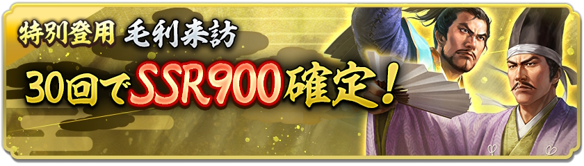毛利家の武将をピックアップした有償小判10連限定の登用。SSR900武将の中から2名選択でき、10回ごとにSSR武将が確定、30回目にはピックアップ武将が確定で入手できる。