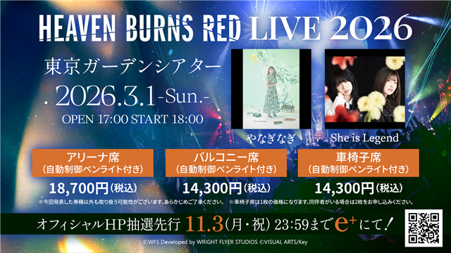 2026年3月1日 東京ガーデンシアターにて、『HEAVEN BURNS RED LIVE 2026』の開催が決定した!オフィシャルHP抽選先行チケットは、e+にて、11月3日23:59まで受付中!配信やグッズ販売などの詳細は続報をお待ちください。
