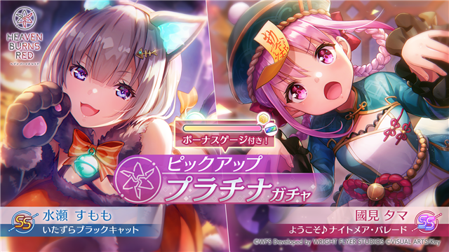 今回のピックアッププラチナガチャは、新スタイルのSS<レゾナンス>[ようこそ♪ナイト メア・パレード] 國見タマ、SS[いたずらブラックキャット] 水瀬すももがピックアップさ れ、提供割合がアップする。