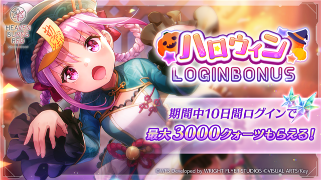 ライトフライヤースタジオとKeyは、『ヘブンバーンズレッド』において、10月17日11:00より、「SS<レゾナンス>國見タマ/SS 水瀬すもも登 場!ピックアッププラチナガチャ」を開始した。さらに、合計で最大3,000クォーツが獲得できる、ハロウィン ログインボーナスも開催!