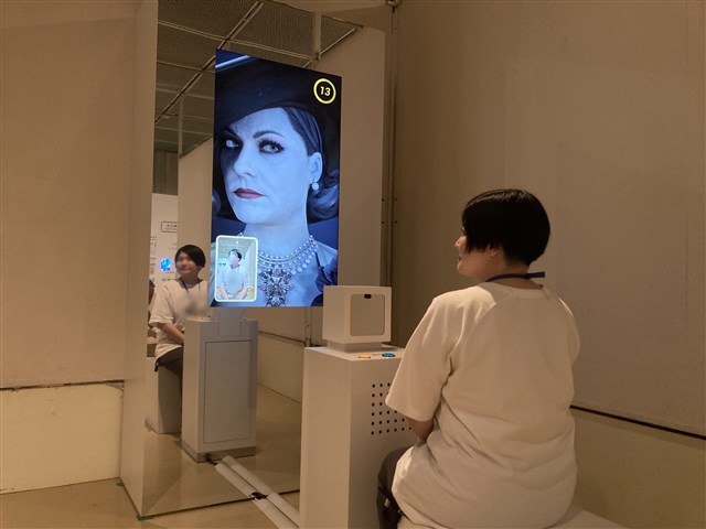 最新のキャラクター表情制作技術の一端を展示。鏡を模したモニターの前に座って表情を変えると、それに合わせてキャラクターの表情もリアルタイムで変化する体験コーナー。