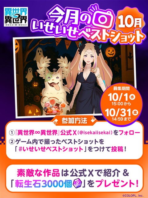 『異世界∞異世界』の公式X(https://x.com/isekaiisekai)をフォローして、ゲーム内で撮ったベストショットを #いせいせベストショットをつけて投稿しよう!ベストショットに選ばれた方には転生石3,000個をプレゼントする。