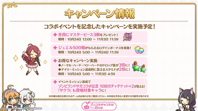 10月24日からのコラボイベント開催を記念したキャンペーンを実施予定。対象期間にログインされた方には、マスターピース3個、ジュエル500個をプレゼントする。また、コラボイベント開催期間中はメインクエストのノーマル・ハード・ベリーハードのアイテムのドロップ量が3倍になる他、デイリーミッション達成時に貰えるスタミナが通常時の2倍貰えるキャンペーンも開催する。さらに、コラボイベントでイベントミッションを達成すると、登場対象キャラに「サクラ」も含まれる「ゾンビランドサガコラボ記念10回ガチャチケット」が2枚貰える。