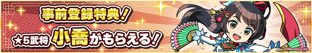 いますぐ事前登録をして【★5武将《小喬》】をもらおう!三国志の登場武将の中でも人気の《小喬》が事前登録特典としてもらえる。ぜひ事前登録をしてサービス開始をお待ちください。