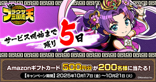 『ブラウザ三国志 天』のサービス開始日の決定を記念して、Amazonギフトカード500円が合計200名に当たるキャンペーンを開催!
