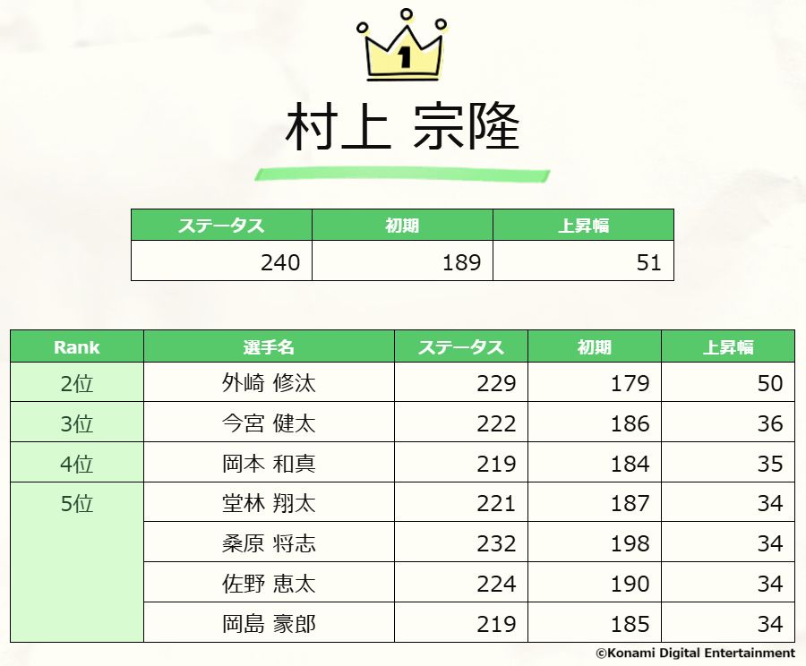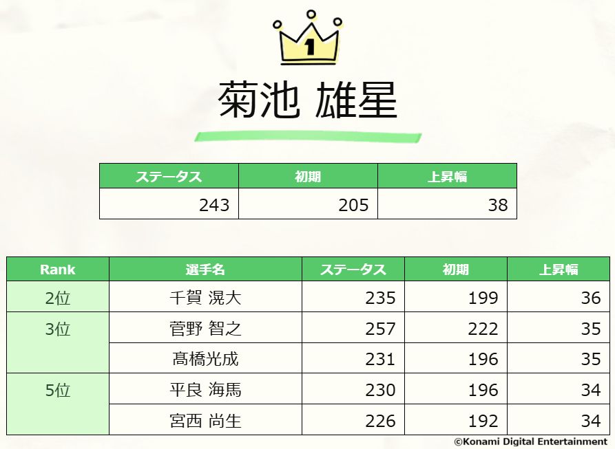 野手は「ミート・パワー・走力」、投手は「球威・制球・スタミナ」の3つの能力値の合計について、通常選手としての初登場時と最高値のデータの上昇幅を測定してランキング化した。