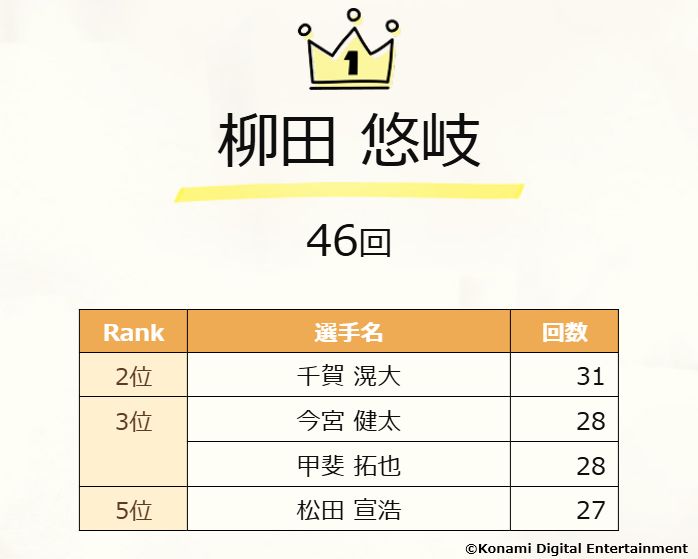 スカウトでSランクとして実装され、ユーザーから最も獲得された選手を12球団別にランキング。