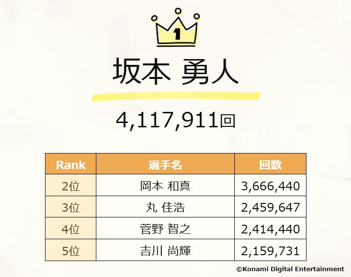 第一線で長く活躍する選手が名を連ね、リアルタイム対戦でも採用率が高い選手がランクインしている。