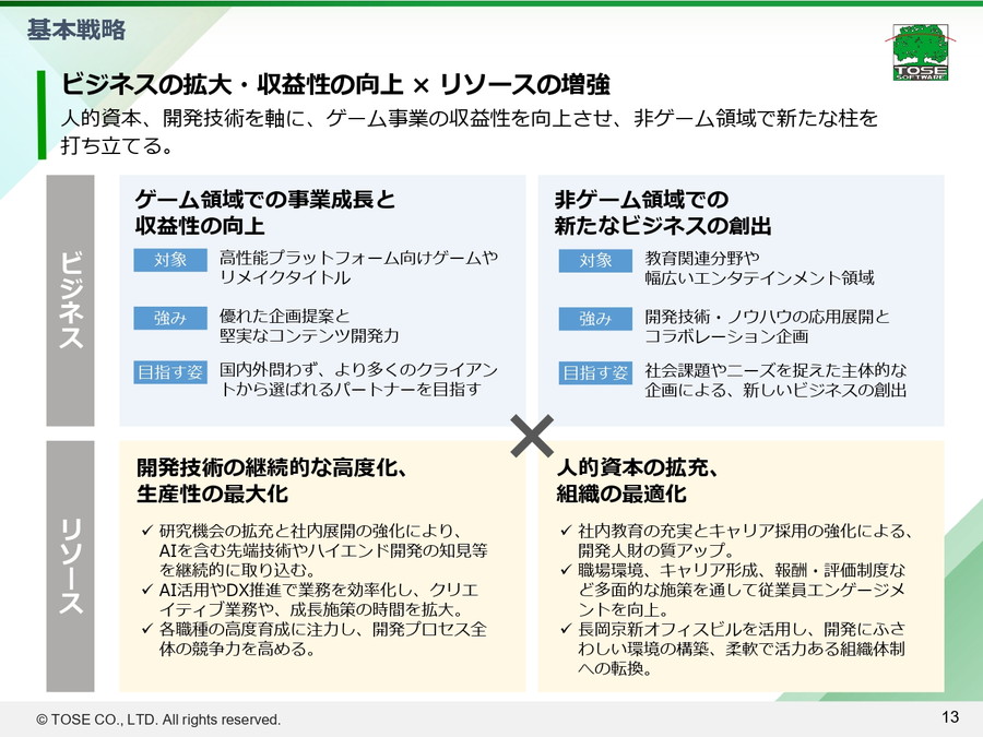 中期的な経営課題として「ビジネス拡大と収益性の向上」「リソース(人的資本・開発技術)の強化」を掲げている。