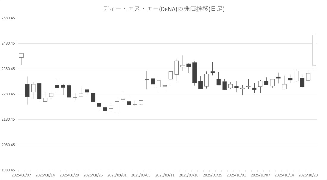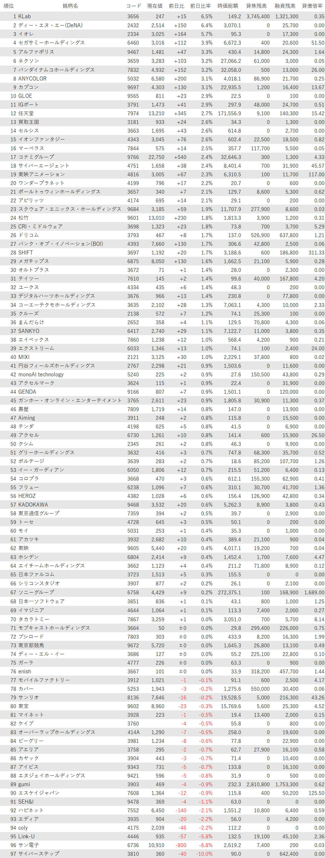 最後に騰落ランキングを見ると、KLab<3656>やDeNA<2432>、イオレ<2334>、セガサミーHD<6460>が値上がり率上位となり、サイバーステップ<3810>、Link-U<4446>、coly<4175>、エディア<3935>が値下がり率上位となった。