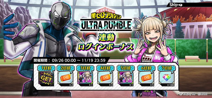 家庭用ゲーム『僕のヒーローアカデミア ULTRA RUMBLE』との連動キャンペーンも開催中だ。期間中、連動スペシャルミッションやログインボーナスが開催され、入手した「ULTRA RUMBLE 連動ガシャチケット」で特別な「ULTRA RUMBLE 連動ピックアップガシャ」が利用できる。ログインボーナスは2025年11月19日23:59まで、連動ピックアップガシャは2025年11月26日23:59まで開催予定である。