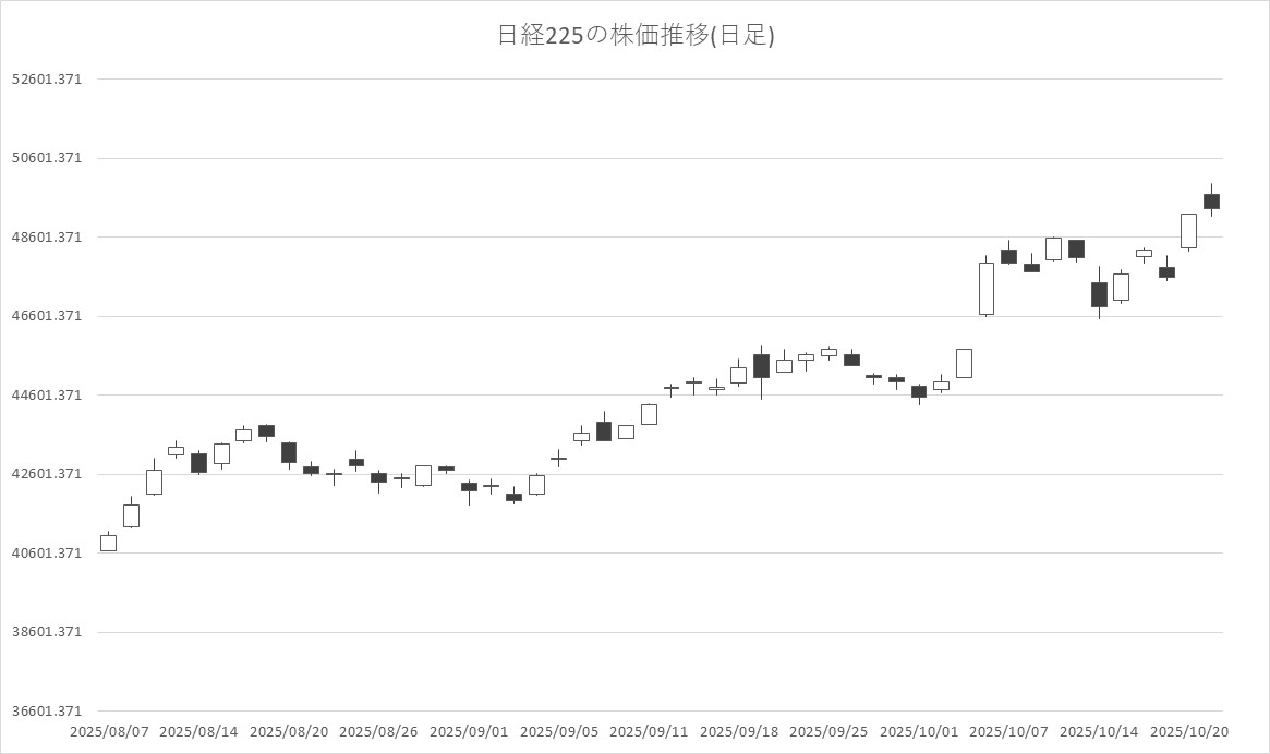 10月21日の東京株式市場は続伸。日経平均株価は、前営業日比130円56銭高の4万9316円06銭でこの日の取引を終えた。高市早苗自民党総裁の首相就任への期待から買い優勢となり、一時、5万円まで迫る場面があった。午後に入って高市首相が選出されると材料出尽くしとなり、一時マイナス圏に沈む場面もあった。