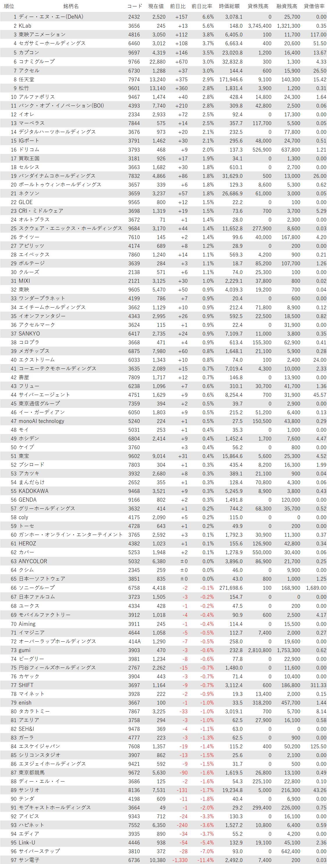 最後に騰落ランキングを見ると、DeNAやKLab<3656>、東映アニメ<4816>、セガサミーHD<6460>が値上がり率上位となり、サン電子<6736>、Link-U<4446>、エディア<3935>、ハピネット<7552>が値下がり率上位となった。