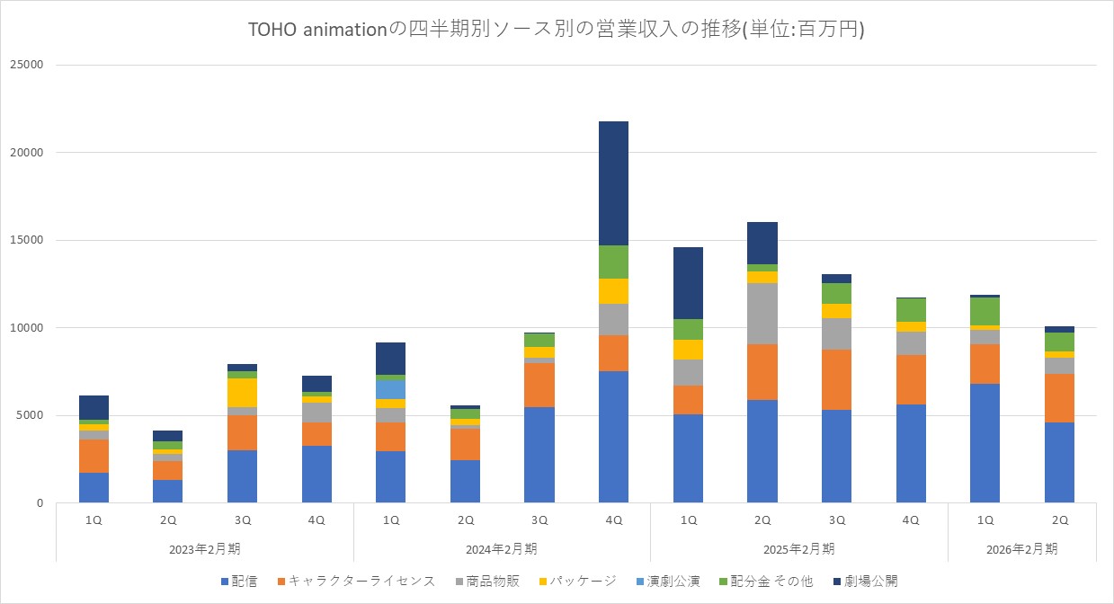 国内劇場公開の収入を含めると、営業収入は、前年同期比28.4%減の219億6700万円だった。劇場公開の収入は前年同期比で92.3%減の5億0400万円と大きく低下した。前年同期は「劇場版 ハイキュー!! ゴミ捨て場の決戦」「僕のヒーローアカデミア THE MOVIEユアネクスト」がヒットしており、今期はそれに相当する作品がなかった。