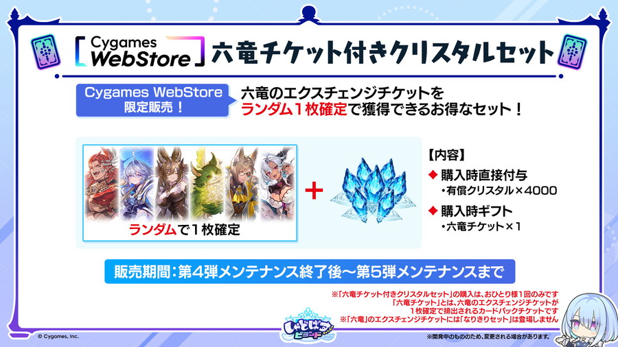 第4弾 メンテナンス終了後から Cygames WebStore 限定で有償クリスタル4000個と六竜の特別なエクスチェンジチケットをランダムで1枚獲得できる「六竜チケット」がセットになった「六竜チケット付きクリスタルセット」を販売する。また、有償クリスタル2000個と無償クリスタル200個、レジェンドカードパックチケット3枚、レッドエーテル3500個がセットになった「グランブルーファンタジーコラボ記念!デッキブーストバンドルセット」を販売する。