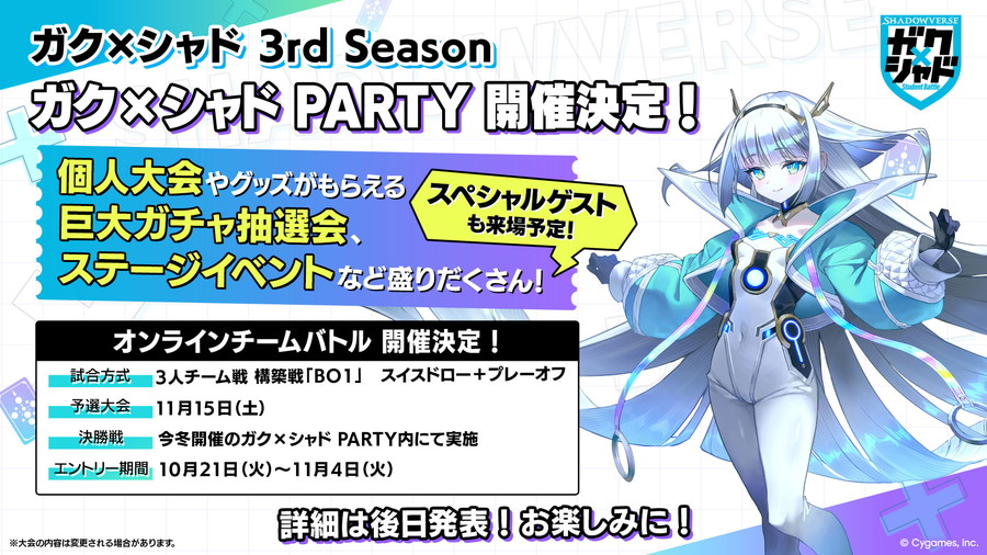 すべての学生に『シャドウバース ワールズビヨンド』を通じて最高の学生生活を送るための学生向けプロジェクト「ガク×シャド」の 3rd シーズンで「ガクシャド PARTY」、個人戦大会、チーム戦大会の開催が決定した。詳しくは公式サイトを確認してほしい。
