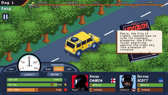 本作は、The Oregon Trailとダカールラリーを組み合わせたような、レトロ風の戦略的ラリーアドベンチャーゲーム。プレイヤーはヨーロッパとアフリカを横断するレースに挑み、チーム、車両、物資を戦略的に管理しながら、危険な地形をナビゲートする。道中の各課題では、旅に影響を与える難しい決断が迫られる。