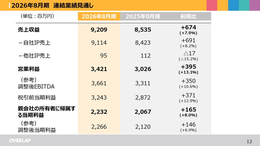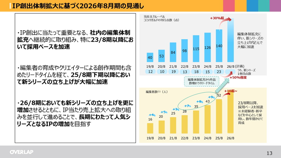 2026年8月期の連結業績予想では、売上収益92億0900万円(前期比7.9%増)、営業利益34億2100万円(前期比13.1%増)、最終利益22億3200万円(前期比8.0%増)を見込んでいる。IP創出体制の拡大、特に編集者の採用ペース加速と新シリーズの立ち上げ大幅加速に基づくものだ。2025年8月期にはライトノベルの刊行点数が大幅に増加し、マンガ化されるIPも増加した。2026年8月期はマンガ化されるIPをさらに大幅に増やし、主力IPとして長期安定的な収益基盤となる作品の増加を目指していく。
