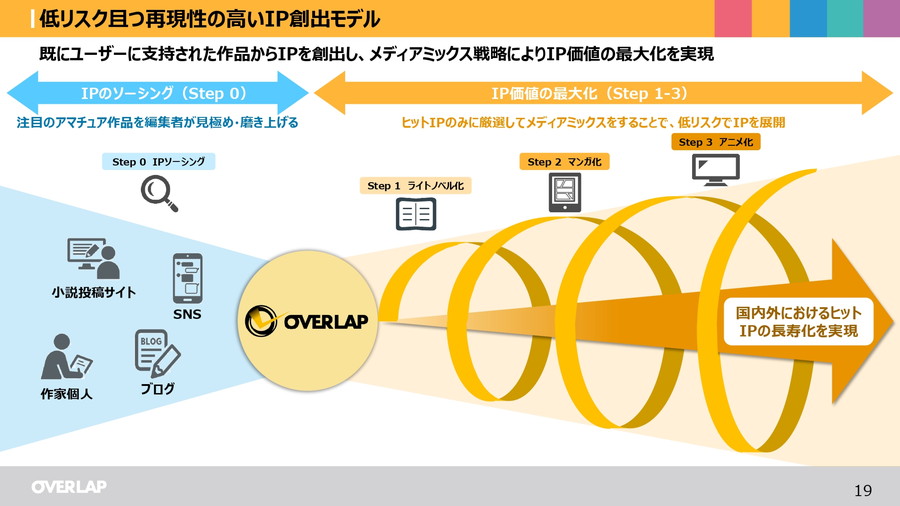 同社は、マンガをIP創出の源泉とし、低リスクかつ再現性の高いIP創出モデルを構築している。小説投稿サイトやSNSからのアマチュア作品を編集者が見極め、ライトノベル化、マンガ化、アニメ化とステップを踏むことでIP価値を最大化する。また、チーム単位での編集体制とシステム化した編集プロセスにより、編集未経験者でも早期に戦力化できる独自の強みを持つ。中長期的なビジョンとして、IP数の増加、メディアミックスの強化、海外収益の拡大を掲げ、持続的な成長を目指している。