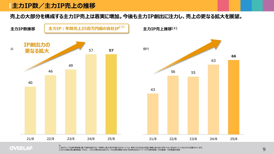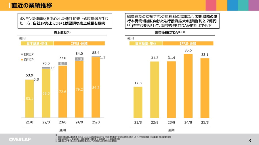 オーバーラップホールディングス<414A>は、2025年8月期の決算説明資料を公開した。25年8月期の連結業績(IFRS)は、売上収益が前期比1.6%増の85億3500万円、営業利益が同40.7%増の30億2600万円、最終利益は同80.1%増の20億6700万円と大幅増益だった。自社IP売上が堅調に拡大した一方、ポケモン関連商材を中心とした他社IP売上が減少した。編集体制の拡充やコンテンツへの投資を中心とした成長投資も拡大しており、調整後EBITDAは同7.1%減の33億1100万だった。年間刊行点数は391点、電子売上比率は72.7%と高い水準を維持している。主力IP(年間売上億2500万円超の自社IP)数は57点で、主力IP売上も着実に増加している。