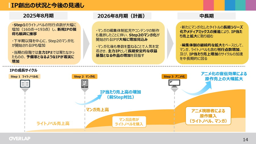 中長期的には、新たにマンガ化したタイトルの長期シリーズ化やメディアミックスを推進し、IP当たり売上を拡大していく方針。「とんでもスキルで異世界放浪メシ」第2期や、「暗殺者である俺のステータスが勇者よりも明らかに強いのだが」、「お気楽領主の楽しい領地防衛」のアニメ化を予定しており、継続的なアニメ化とシリーズ化・他メディア展開により、主力IPの売上拡大と収益サイクルの長寿化を図る。