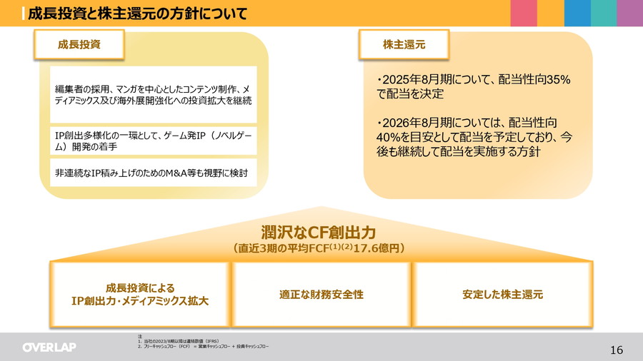 成長実現のための投資として、編集者の採用、マンガを中心としたコンテンツ制作、メディアミックス、海外展開強化への投資拡大を継続し、ゲーム発IPの開発やM&Aも視野に入れている。株主還元については、2025年8月期は配当性向35%で配当を決定し、2026年8月期は配当性向40%を目安として、今後も継続して配当を実施する方針。