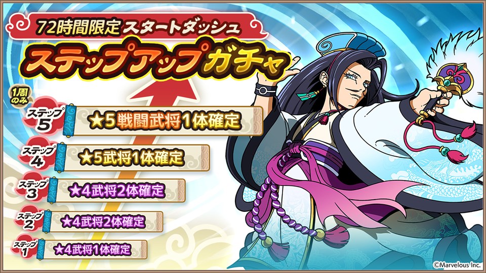 72時間限定、1周限定で5段階のステップアップガチャを開催する。ステップ4で【★5武将】が1体確定!さらにステップ5で【★5戦闘武将】が1体確定となる。