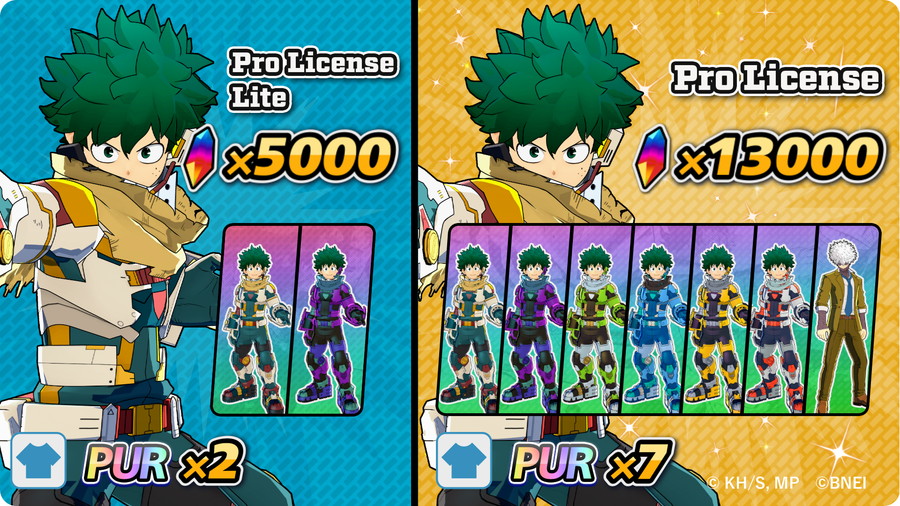 シーズン13ライセンスが登場中!「緑谷出久 OFA("個性"アシストギア OFAver.)」の衣装や様々なアイテムが入手できる。さらに今シーズンも、プロライセンスの報酬のうち1~25までが手に入る「プロライセンス・ライト」が利用可能。