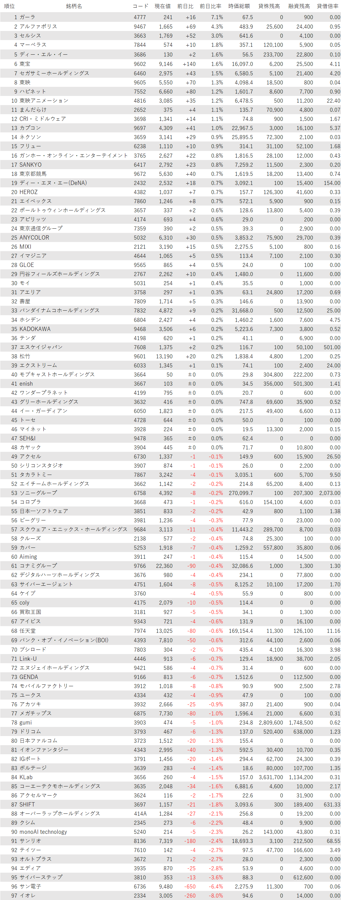 最後に騰落ランキングを見ると、ガーラ<4777>やアルファポリス<9467>、セルシス<3663>、マーベラス<7844>が値上がり率上位となり、イオレ<2334>、サイバーステップ<3810>、エディア<3935>、オルトプラス<3672>が値下がり率上位となった。