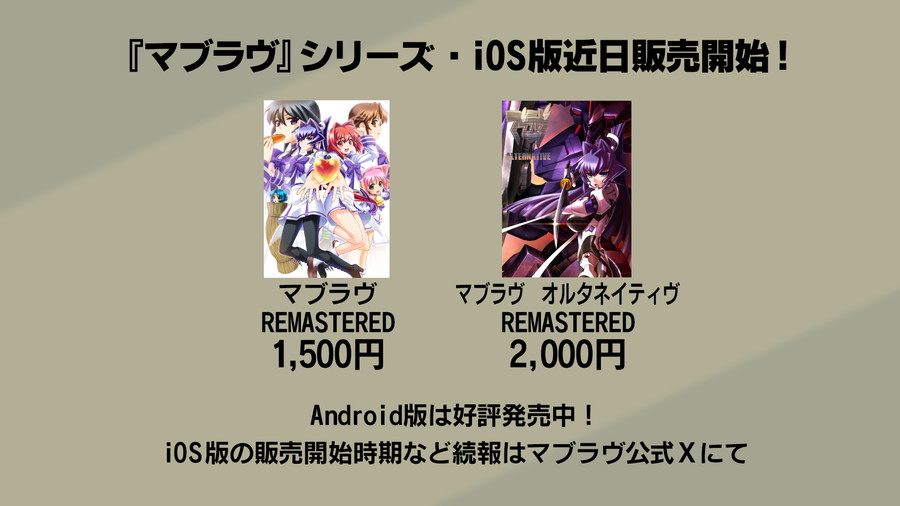 これまでAndroid版のみだったスマートフォン版が近日iOS版でも販売開始される。『マブラヴ』は1,500円、『マブラヴ オルタネイティヴ』は2,000円(いずれも税込)である。