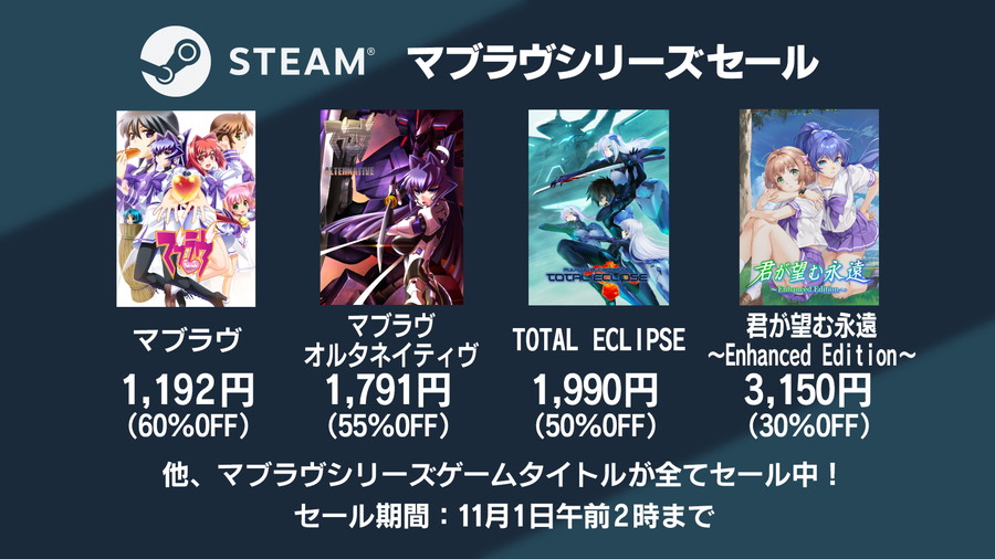 イベント開催を記念して、Steamとマイニンテンドーストアにてマブラヴシリーズのセールが開催中である。