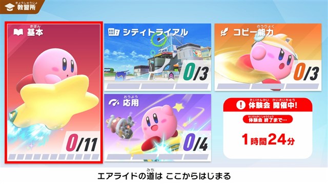 体験会用ソフト『カービィのエアライダー おためしライド』は11月7日の午後に「ニンテンドーeショップ」で配信予定。開催時間外でも操作の基本を学べる「教習所」をプレイ可能。事前に操作方法の確認をしておくこともできる。