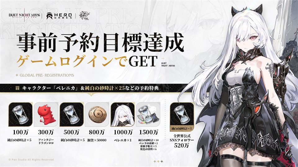 事前予約者数の累計人数に応じて、正式配信後にゲーム内で使用できるアイテムをプレセントするキャンペーンを開催してり、本日時点で最終目標の1500万人を達成したためすべての事前予約特典の配布が決定した。