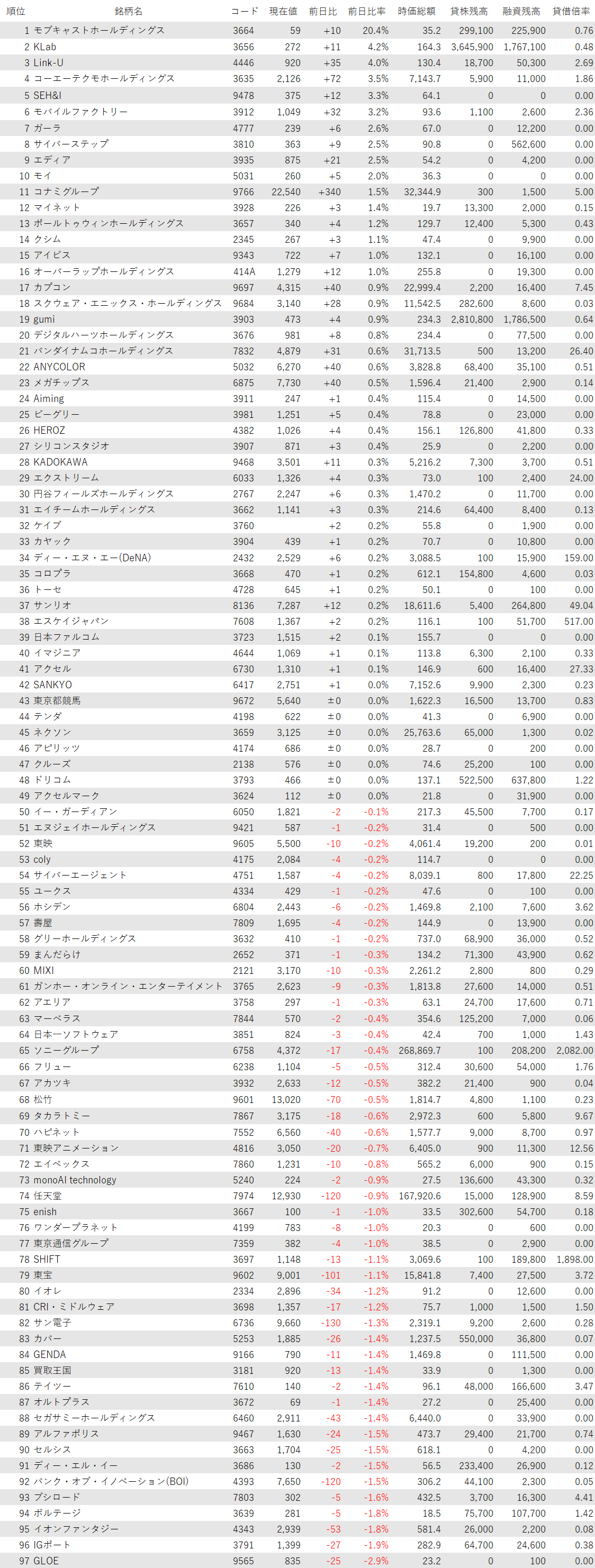 最後に騰落ランキングを見ると、モブキャストHD<3664>やKLab<3656>、Link-U<4446>、コーエーテクモHD<3635>が値上がり率上位となり、GLOE<9565>、イオンファンタジー<4343>、ボルテージ<3639>、ブシロード<7803>が値下がり率上位となった。