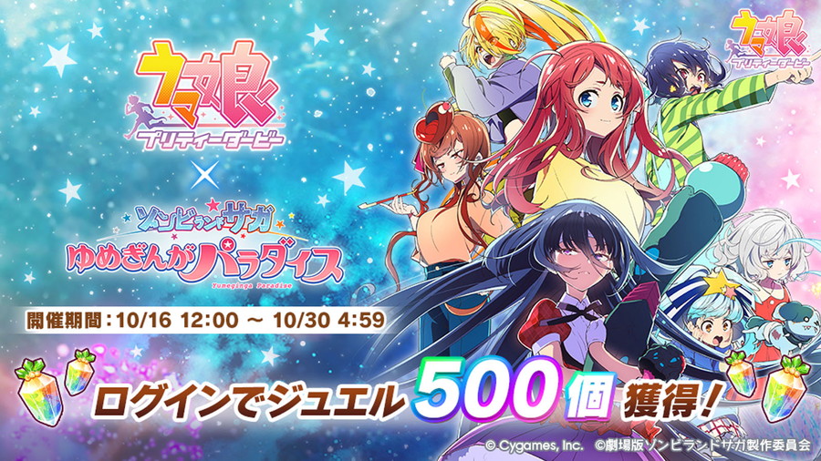 10月24日12:00から、「ウマ娘 プリティーダービー」×「劇場版『ゾンビランドサガ ゆめぎんがパラダイス』」コラボ記念ログインボーナスが開催中。開催期間中にログインすると、ジュエル500個をプレゼントする。