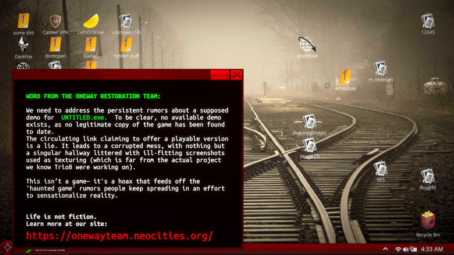 本作は、インターネットの暗部が現実となる一人称視点シングルプレイヤーホラーパズルゲームで、3人の開発者が悲劇的な結末を迎えた未完成のプログラム「UNTITLED.EXE」を探索する。