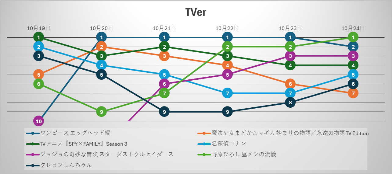 TVerのアニメランキングは、『ワンピース エッグヘッド編』が19日時点では10位と低調なスタートだったが、その後一気に順位を上げ、20日以降は1位を維持し続けた。24日には2位へと順位を落としたものの、週を通じて圧倒的な存在感を示したといえる。