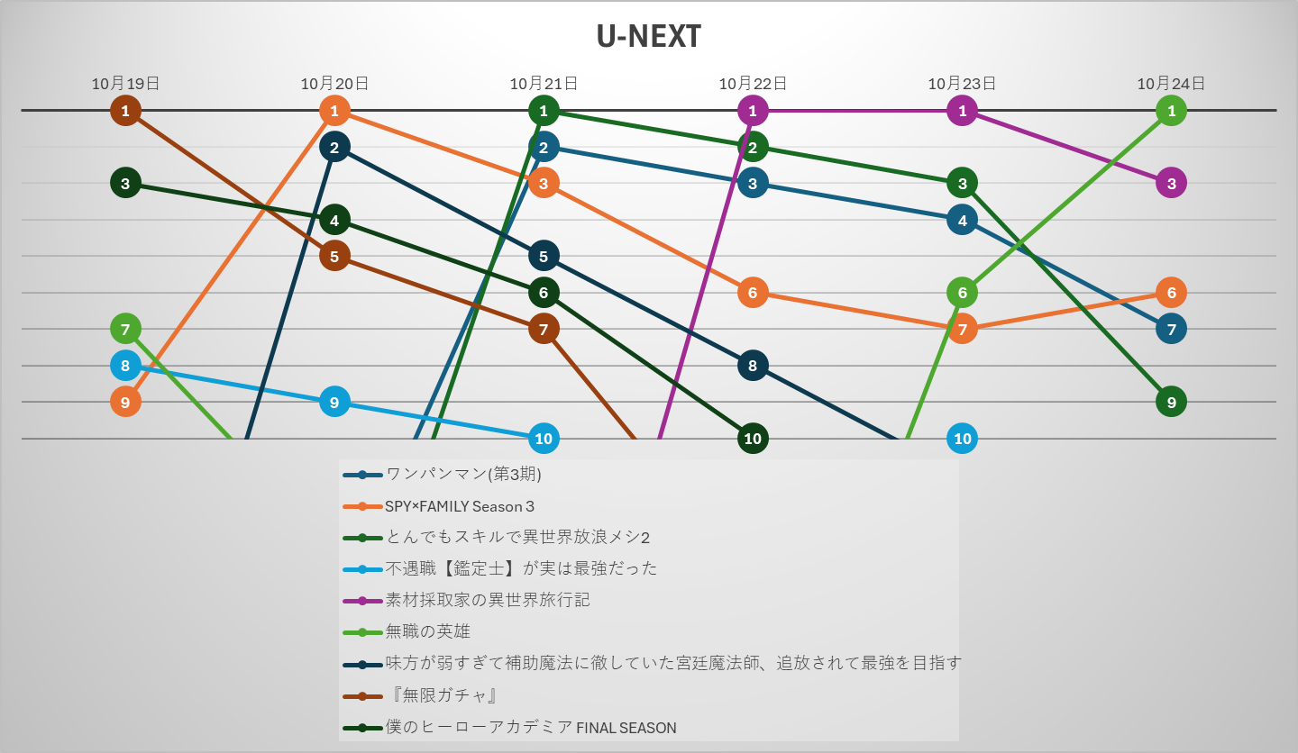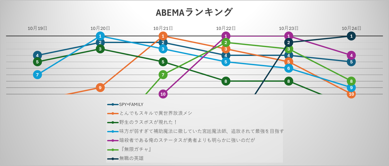 「暗殺者である俺のステータスが勇者よりも明らかに強いのだが」 も同様に急上昇を記録。19日には22位だったが22日には1位に到達し、翌23日も首位をキープ。24日も4位と上位に定着しつつある。強い話題性と集中視聴の流れを背景に、配信日ごとの爆発力が目立つ。