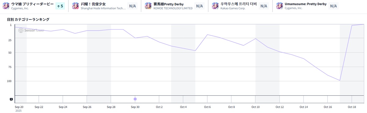 10月20日9時現在のApp Storeセールスランキング(ゲームカテゴリー)は、Cygamesの『ウマ娘 プリティーダービー』が首位となった。