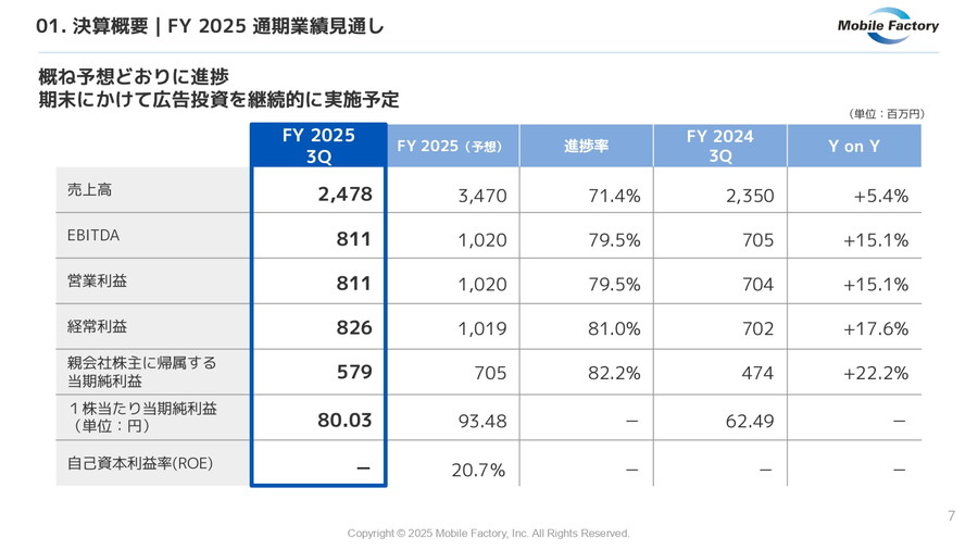 第3四半期決算までは概ね計画どおりに進捗しているとし、通期業績見通し(売上高34億7000万円、営業利益10億2000万円、純利益7億0500万円)は変更なし。期末にかけても継続的な広告投資を予定している。