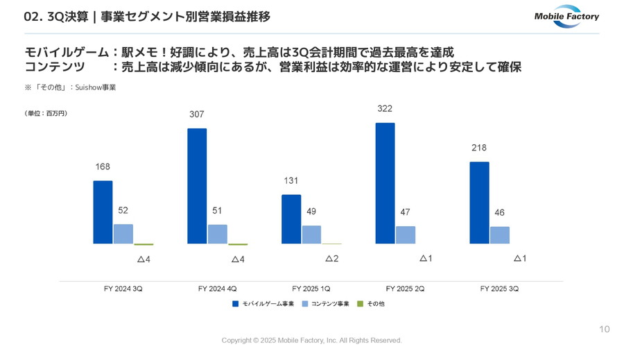 第3四半期会計期間である3Q(7〜9月)の業績を見ると、売上高が同11.8%増の8億2100万円、営業利益が同21.4%増の2億6300万円と2ケタ増収増益と好調だった。「駅メモ!」シリーズの運営が好調を維持した。その一方で、コンテンツ事業は売上が減少傾向にあるものの、効率的な運営により安定した収益を確保。「その他」事業としては、メタバース・3Dアバター関連のSuishow事業を展開している。